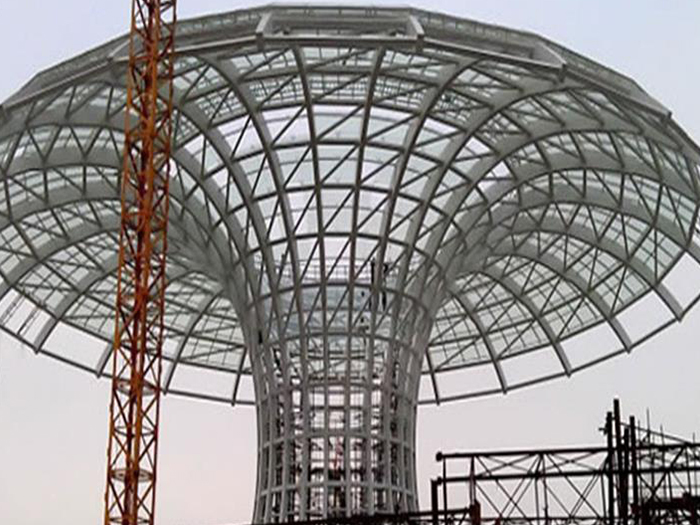 二、球形网架结构因其结构新颖,受力合理,自重轻、用钢量低等优点。如大型体育场馆球形日照螺栓球网架、公共场馆球形网架、电厂日照螺栓球网架、水泥工业球形网架、仓储物流球形网架、日照干煤棚工业球形网架、日照收费站日照加油站球形网架、展览中心、影剧院、商场、航站楼、候车厅、工厂日照车间、仓库、电视塔等球形螺栓球节点网架。国内球形网架结构主要分为:日照焊接球节点网架及螺栓球节点网架两种。螺栓球节点网架其构件工厂内加工量较大,现场安装便捷,适用于现场工期紧,日照施工条件、用电量受制约,网架形状复杂、日照杆件定位困难的异形结构。螺栓球节点球形网架系统基本由日照杆件、螺栓球、支撑支座等组成。按照节点形式可分为交叉日照桁架体系、四角锥体系、三角锥体系等。支撑方式多为固定支座支撑。对于大面积、大跨度及有特殊受力或伸缩要求的网架结构可采用橡胶支座、滑移支座、球铰支座等支撑形式,以满足结构自身的受力稳定、均衡,便于内力释放等设计要求。